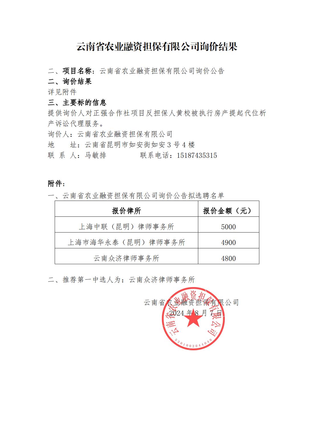云南省農(nóng)業(yè)融資擔(dān)保有限公司詢價(jià)結(jié)果
