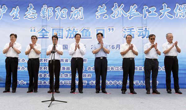 6月7日,作為“全國放魚日”主會場活動,農業(yè)農村部會同江西省人民政府在“長江之腎”鄱陽湖聯合舉辦水生生物增殖放流活動,農業(yè)農村部部長韓長賦,江西省委書記、省長劉奇等出席活動?;顒悠陂g,共向鄱陽湖放流四大家魚、河蟹和胭脂魚等水生生物苗種230余萬尾,還首次采用無線電遙測技術,對鄱陽湖長江江豚的晝夜活動規(guī)律開展研究,為更好地保護和拯救長江江豚提供科學支撐。