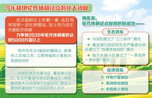 在2月23日的農(nóng)業(yè)部新聞發(fā)布會上,農(nóng)業(yè)部種植業(yè)司司長曾衍德表示,今年我國耕地輪作休耕試點將擴大規(guī)模,試點面積比上年翻一番,此后每年按照一定比例增加,加上地方自主開展輪作休耕,力爭到2020年輪作休耕面積達到5000萬畝以上。同時,還將實現(xiàn)區(qū)域拓展。輪作在東北四省區(qū)的基礎上,新增長江流域江蘇、江西兩省的小麥稻谷低質低效區(qū);休耕在地下水漏斗區(qū)、重金屬污染區(qū)、生態(tài)嚴重退化地區(qū)的基礎上,將新疆塔里木河流域地下水超采區(qū)、黑龍江寒地井灌稻地下水超采區(qū)納入試點范圍。