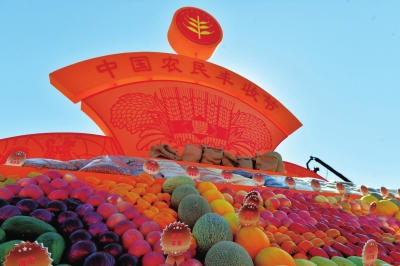 9月23日,首屆中國(guó)農(nóng)民豐收節(jié)主會(huì)場(chǎng)慶典現(xiàn)場(chǎng),優(yōu)質(zhì)農(nóng)產(chǎn)品組成的巨型花壇果香色艷,展示著農(nóng)業(yè)綠色發(fā)展成就。