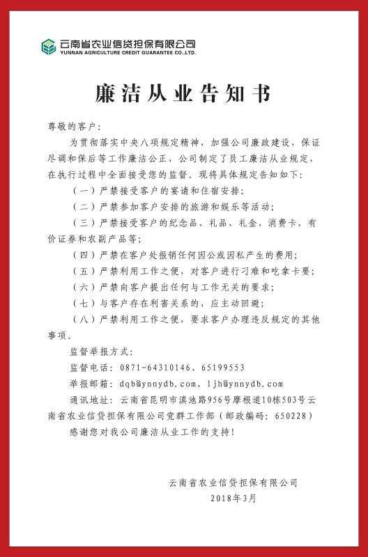 “一杯水”原則和《廉潔從業(yè)告知書》制度的實行,將對進(jìn)一步強化員工的廉潔自律意識和廉潔從業(yè)意識,凈化公司廉政環(huán)境,加強公司廉政建設(shè),維護(hù)公司良好形象發(fā)揮積極作用,托起云南農(nóng)擔(dān)服務(wù)三農(nóng)綠色美好愿景,讓云南農(nóng)擔(dān)在實現(xiàn)云南經(jīng)濟(jì)跨越發(fā)展和服務(wù)三農(nóng)方面走得更高更遠(yuǎn),發(fā)揮更大作用。