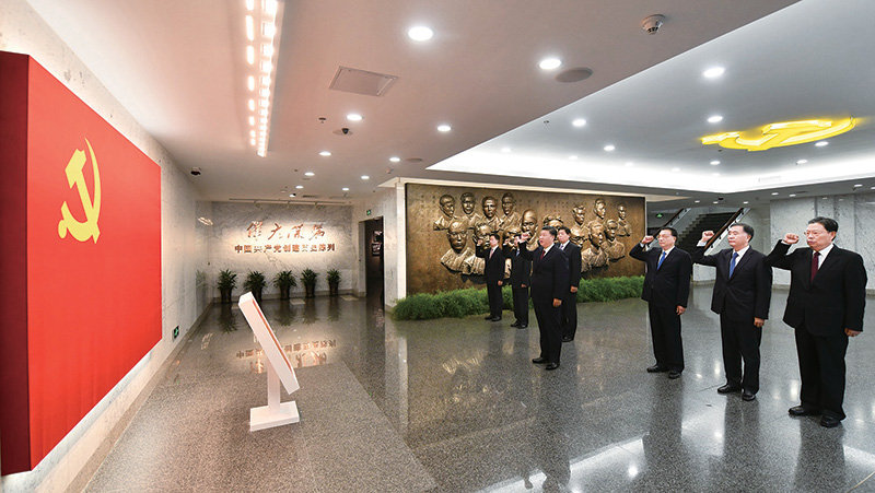2017年10月31日,中共中央總書記、國(guó)家主席、中央軍委主席習(xí)近平帶領(lǐng)中共中央政治局常委李克強(qiáng)、栗戰(zhàn)書、汪洋、王滬寧、趙樂際、韓正,瞻仰上海中共一大會(huì)址和浙江嘉興南湖紅船。這是31日上午,在上海中共一大會(huì)址紀(jì)念館,習(xí)近平帶領(lǐng)其他中共中央政治局常委同志一起重溫入黨誓詞。