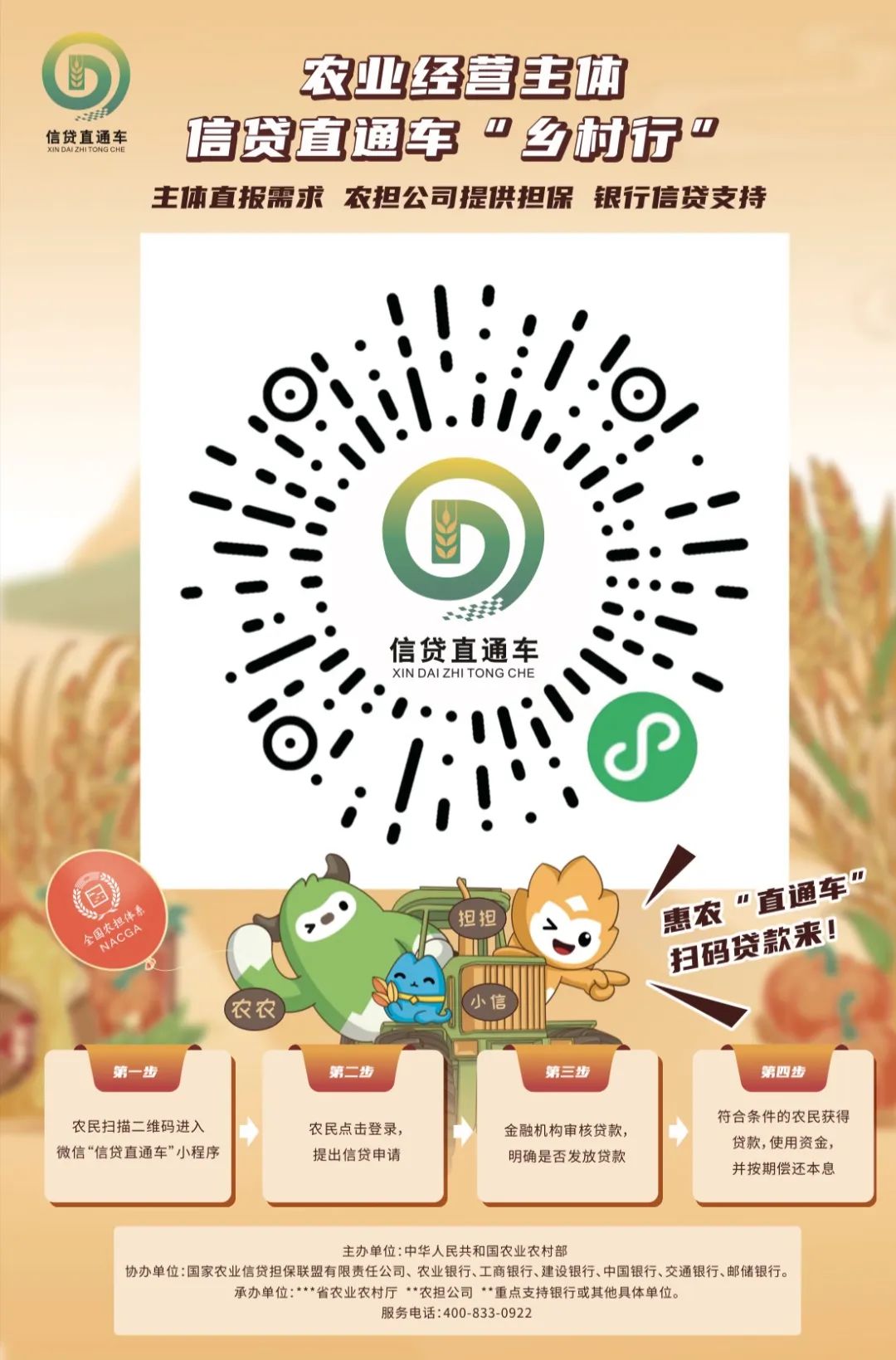 據(jù)悉,“鄉(xiāng)村行”活動將通過集中開展信貸直通車專題宣傳推廣,引導(dǎo)大中型銀行機(jī)構(gòu)服務(wù)下沉,將更多的農(nóng)業(yè)農(nóng)村信貸、擔(dān)保、信用、保險等金融知識普及到村到戶,只需掃描宣傳掛圖中的二維碼即可提出融資需求,進(jìn)一步提升信貸直通車社會知曉度和品牌影響力,擴(kuò)大農(nóng)業(yè)經(jīng)營主體的覆蓋面和受益面,將更多金融資源引村入戶,助力今冬明春糧食生產(chǎn)和鄉(xiāng)村建設(shè)
